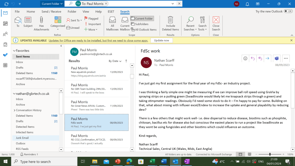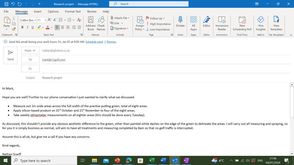Email to Mark, Head Greenkeeper at Swadlincote Golf Centre, to request the use of his site formally, following a telephone conversation.